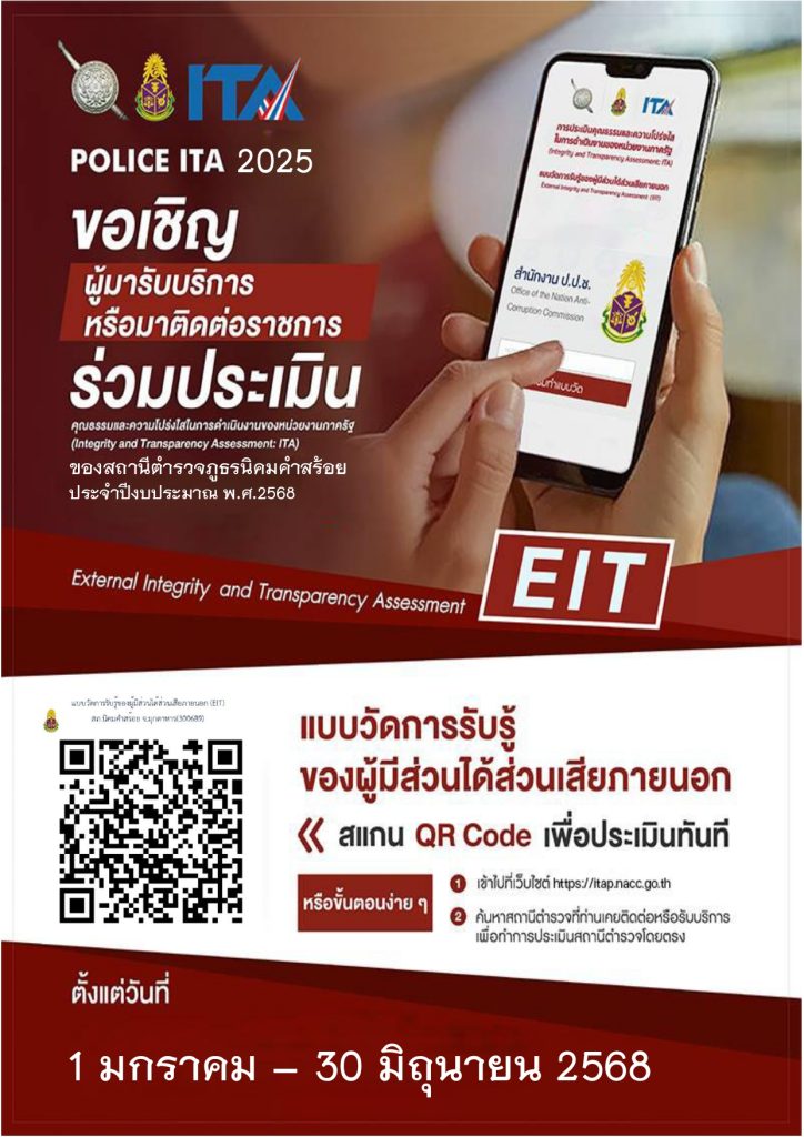 การประชาสัมพันธ์ข้อมูลการตอบแบบวัด EIT ของ สถานีตำรวจภูธรนิคมคำสร้อย ได้ประชาสัมพันธ์ แบบวัดการรับรู้ของผู้มีส่วนได้ส่วนเสียภายนอก (External Integrity and Transparency Assessment: EIT) ณ จุดบริการเบ็ดเสร็จ ณ จุดเดียว (One Stop Service) และหน้าห้องแต่ละสายงานของ สภ.นิคมคำสร้อย ร่วมถึง เว็บไซต์ , เฟสบุ๊ค สื่อสังคม (ออนไลน์) เป็นต้น